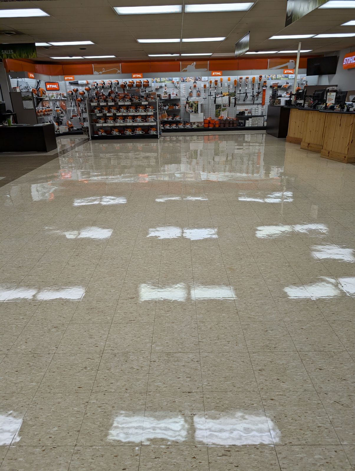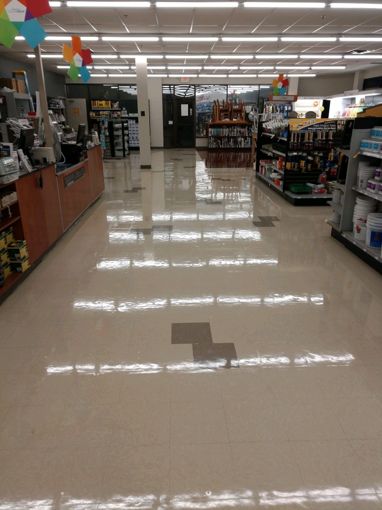 This Floor Looks Like It Was Stripped And Waxed But, It Was Not. This Floors Shine Was The Result of OUR ULTRA GLOSS HIGH SPEED BUFFING. Customer Saved 63 % . This Service Restores that Shine And leaves a Very Hard coating that lasts a Long Time.